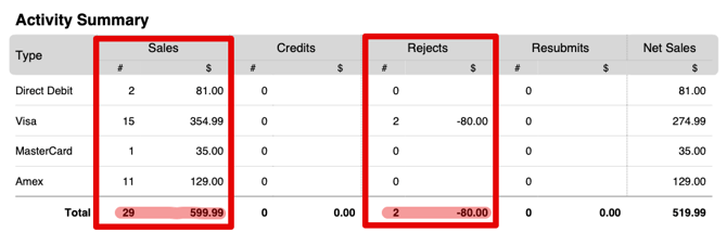 To get the reportable Gross Sales amount from your monthly statement subtract the total rejects from the total sales. The sales column is a total of all sale attempts. The rejects column represents declines and voids which are not included in the reportable Gross Sales amount to the IRS.